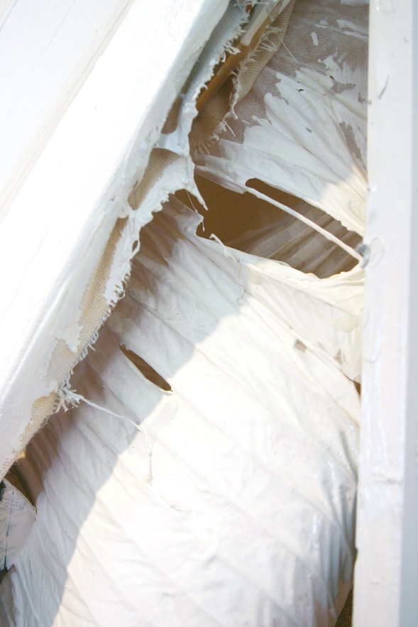 Found Wood, acrylic, latex, enamel,lamp shade, wallpaper