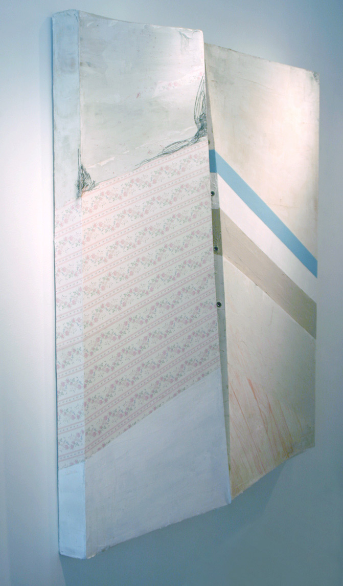 Found wood, acrylic, latex, colored pencil, graphite, fabric, joint compound, wallpaper, plastic, markers 72 x 72″ 2012