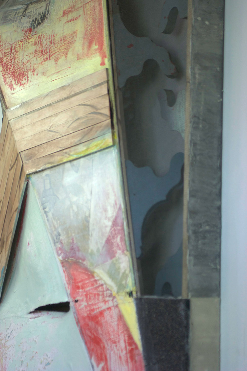 Found wood, shingles,acrylic, latex, colored pencil, screen, wallpaper