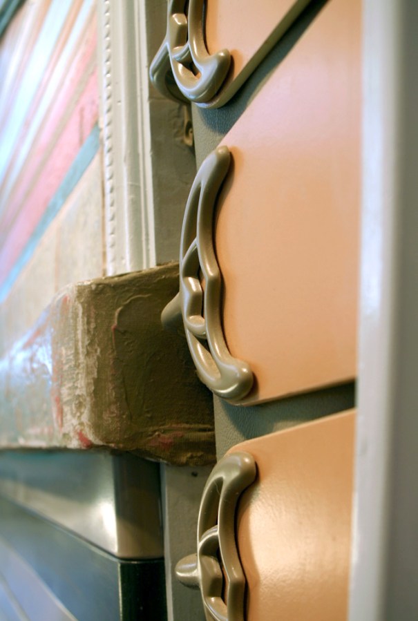 Found wood, steel. repurposed fan blades, tile, wallpaper, acrylic, fabric, spray paint, latex, colored pencil