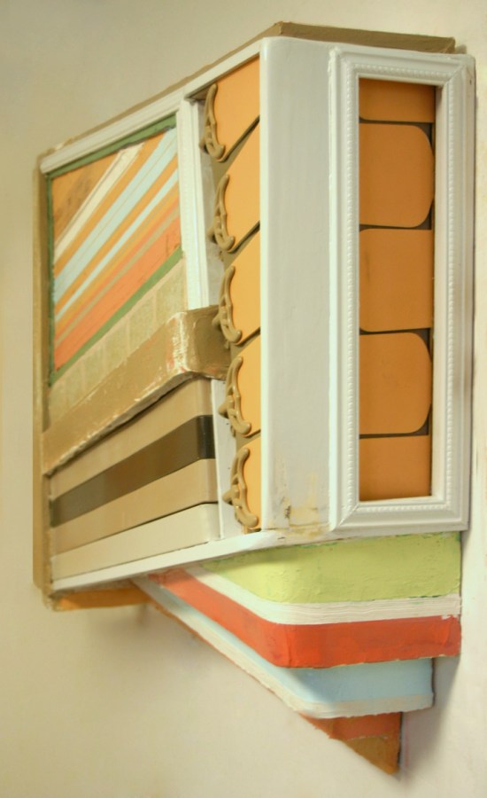 Found wood, steel. repurposed fan blades, tile, wallpaper, acrylic, fabric, spray paint, latex, colored pencil