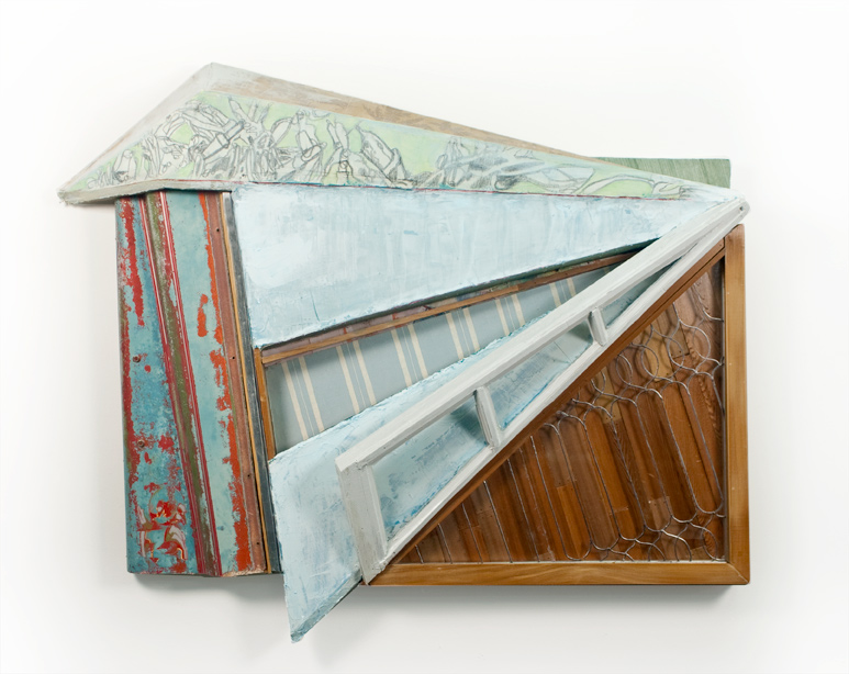Found wood, fiberglass, glass, leading, acrylic, latex, graphite, wallpaper