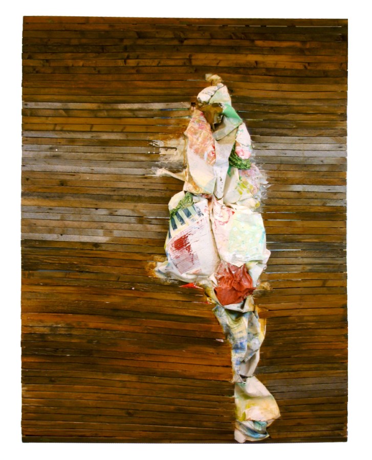 Found wood,acrylic, latex, colored pencil, fabric, joint compound, wallpaper