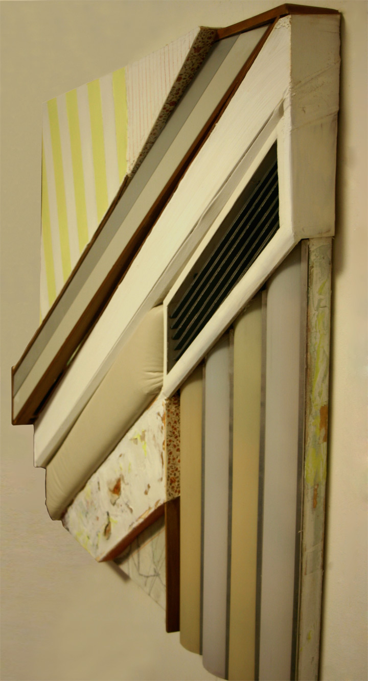 Found wood, steel,carpet, repurposed light fixtures, acrylic, latex, wallpaper, colored pencil