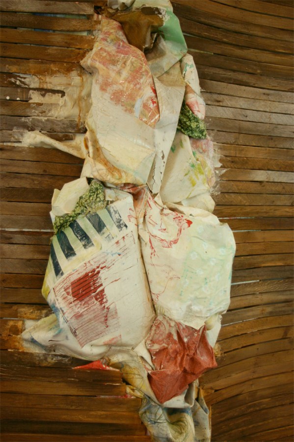 Found wood,acrylic, latex, colored pencil, fabric, joint compound, wallpaper 72 x 96 x 20″ 2012