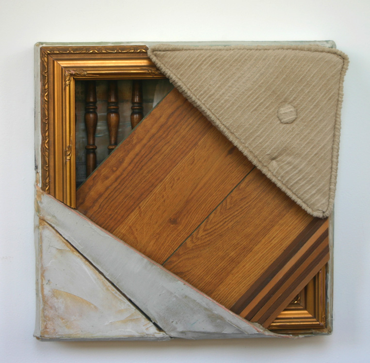 Found wood, found picture frame, wood flooring, acrylic, latex, colored pencil, graphite, fabric, joint compound, wallpaper